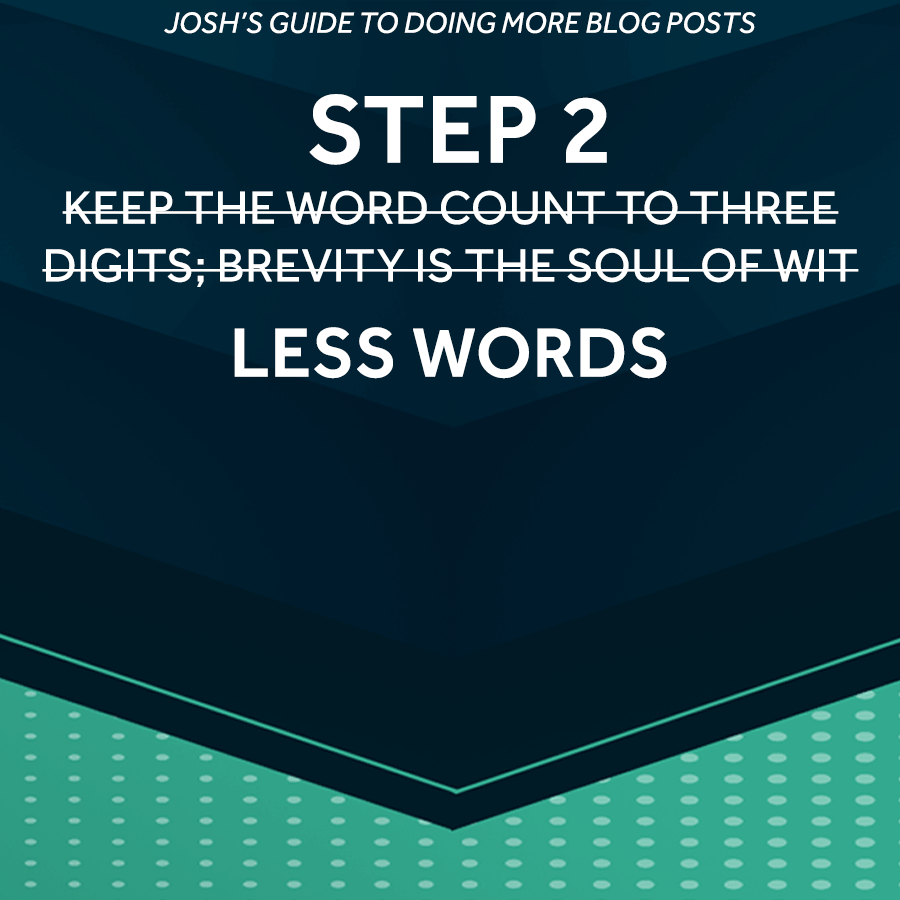 I know what you’re thinking—Josh, you want to write more… by writing less? In short, yes. I’m too wordy. I’m already at 585 words for this post, which is more than I’d like. When I write, I don’t want the ideas I actually care about to drown in my stream of consciousness.