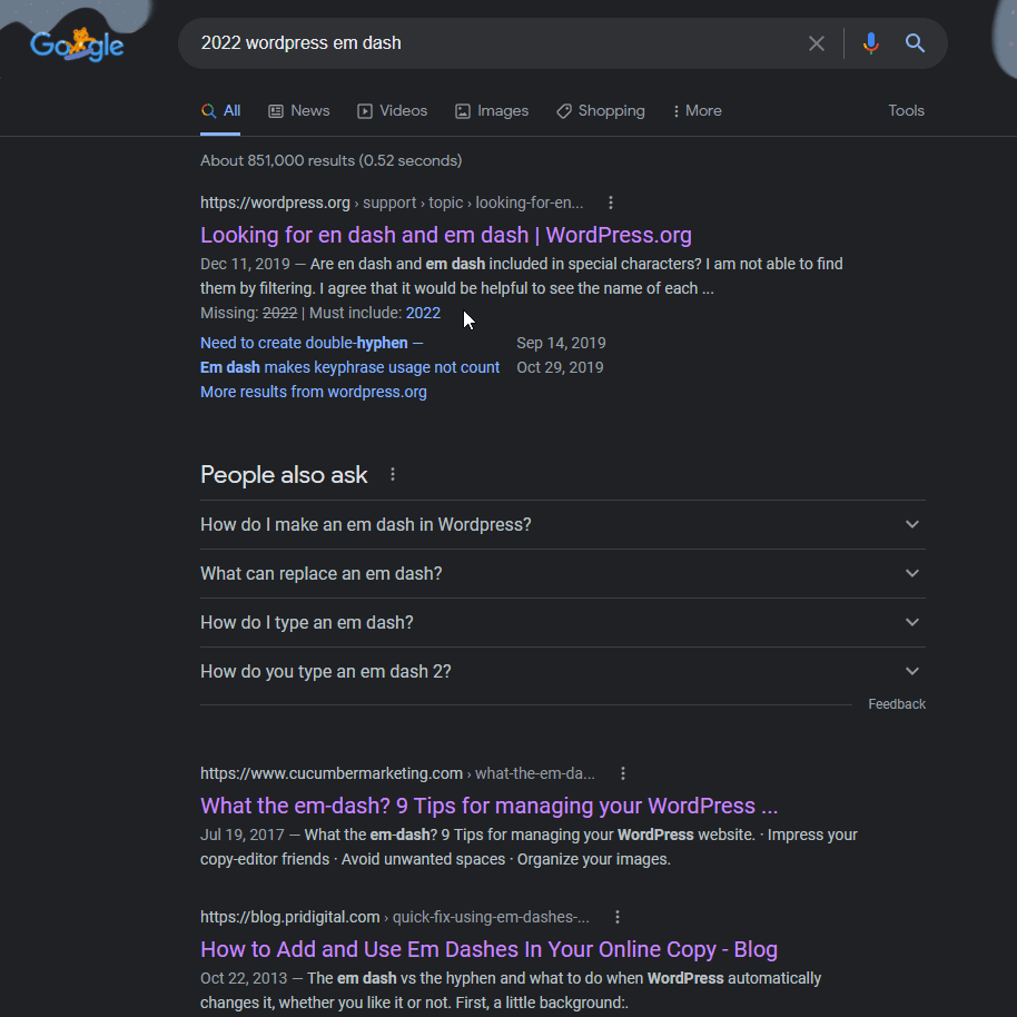 To be fair, I haven’t put much work into learning the ins and outs of WordPress. But, before I googled “em-dash”, I tried “how to type an em-dash in WordPress”. I clicked on 4 or 5 of the top results before realizing that they were all outdated, including screenshots of a WordPress interface that is long gone. Adding 2022 to the search didn’t help either.